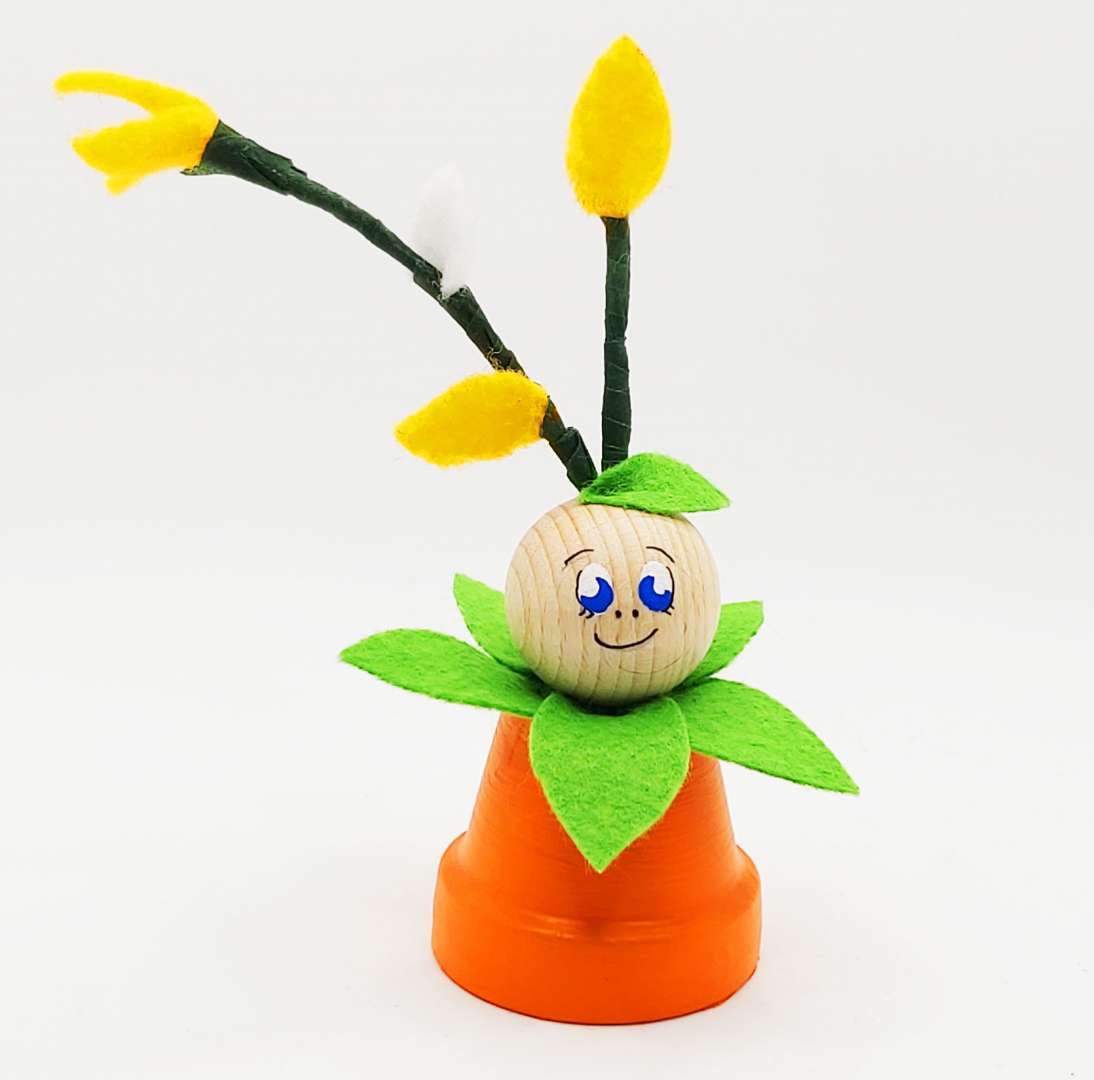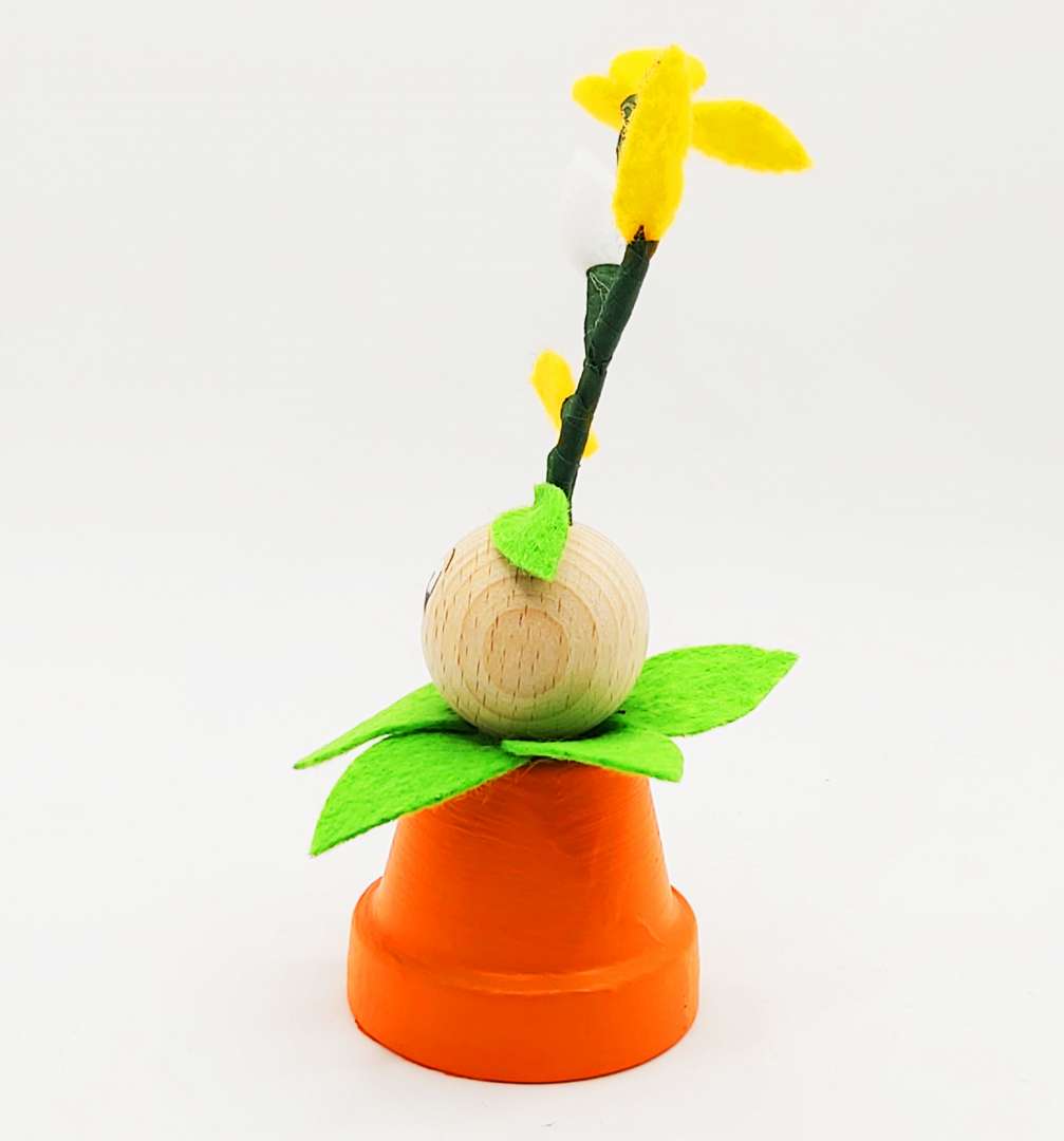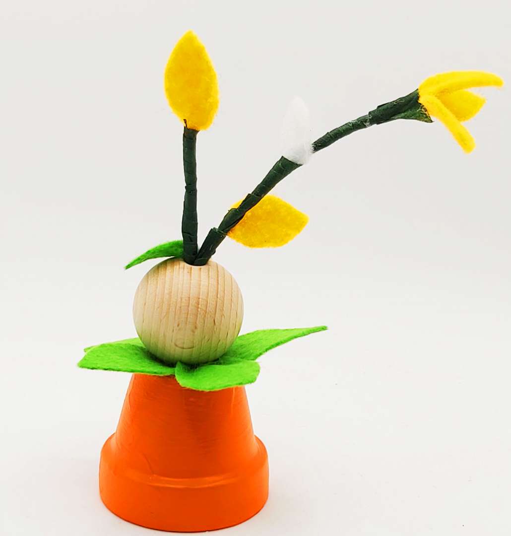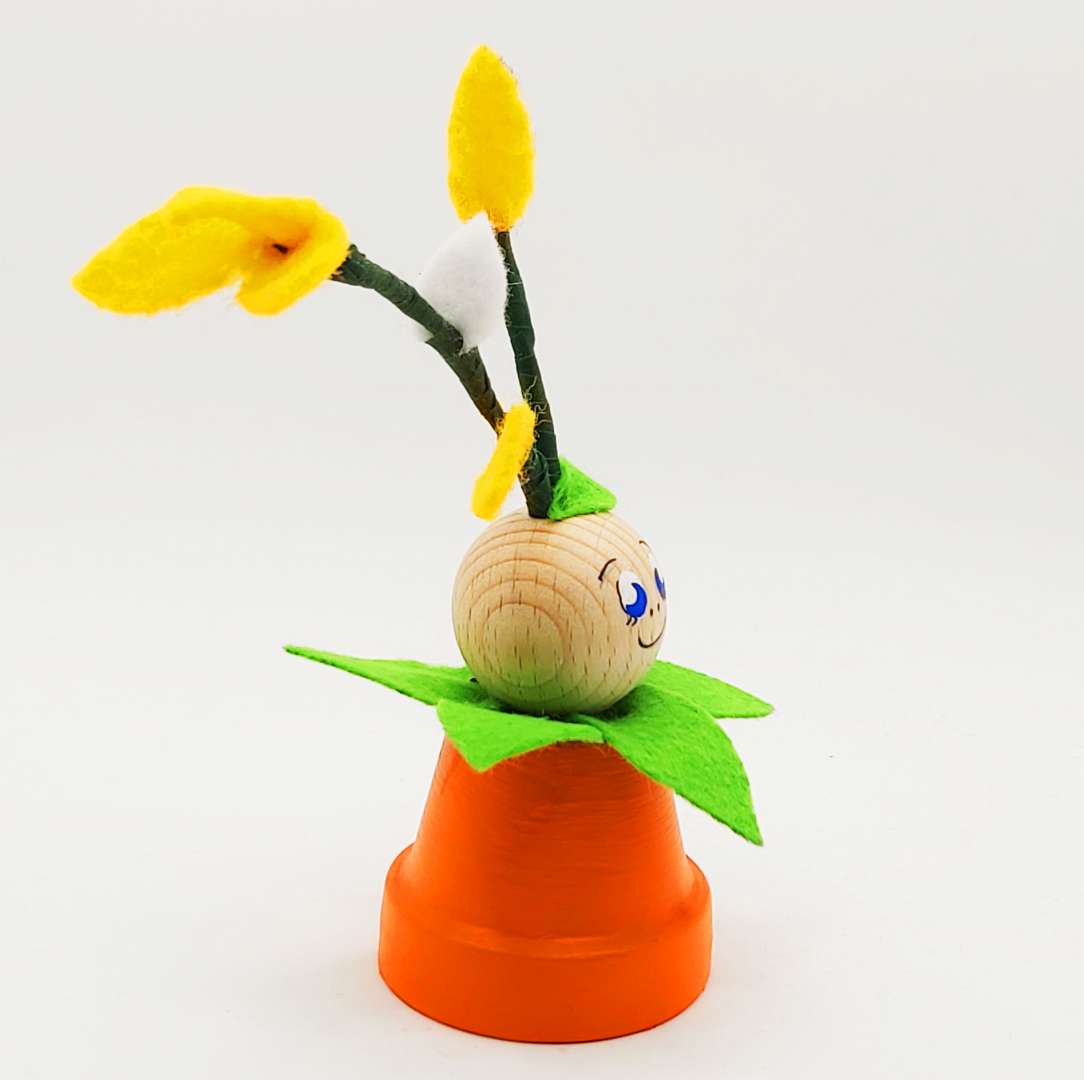 Matériel : Pot en terre cuite, peinture acrylique, feutrine, bois, laine